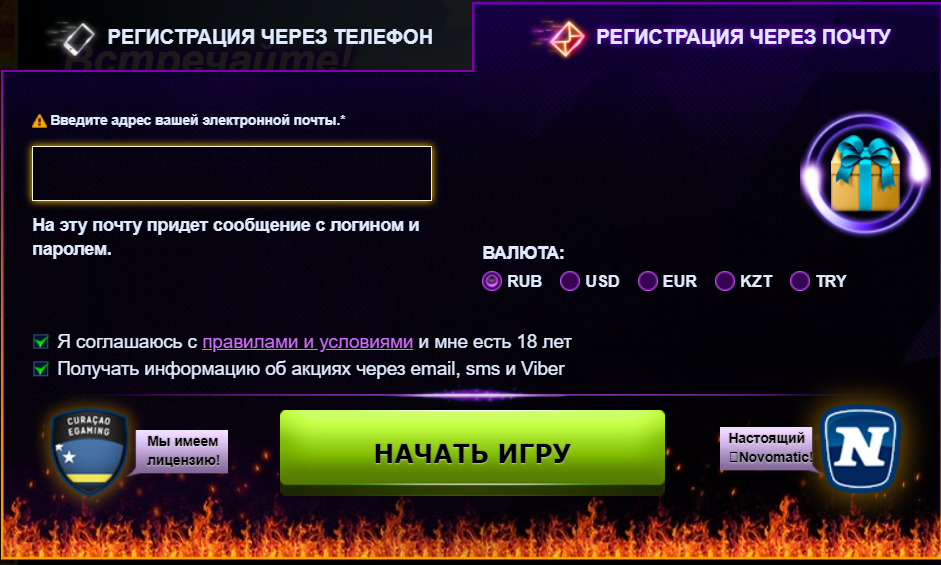 Помимо номера телефона или адреса электронной почты вам будут предложено выбрать валюту аккаунта, ознакомиться с правилами и дать согласие на получение информации от казино.